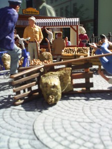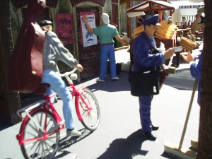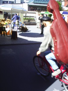 Der Großvater fegt mit seinem Fahrrad so rasant über den Platz, dass er die junge Dame mit ihrer hölzernen Karre glatt von den Beinen holt und selbst zwischen den Kartoffelsäcken stecken bleibt. Der Schornsteinfeger fasst sich erschrocken an seinen Zylinder.
