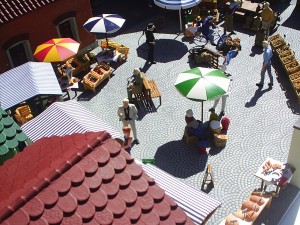 Für die Gebäude, die Pflasterung und die Marktstände fanden Bausätze, bzw. Reste von solchen Verwendung. Die Verkaufsbuden entstanden im Eigenbau aus Pappe und Strukturplatten aus dem Zubehörsortiment.